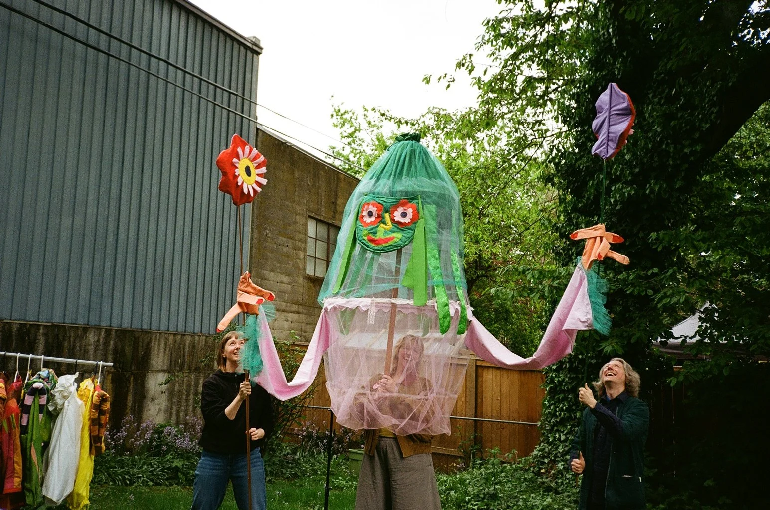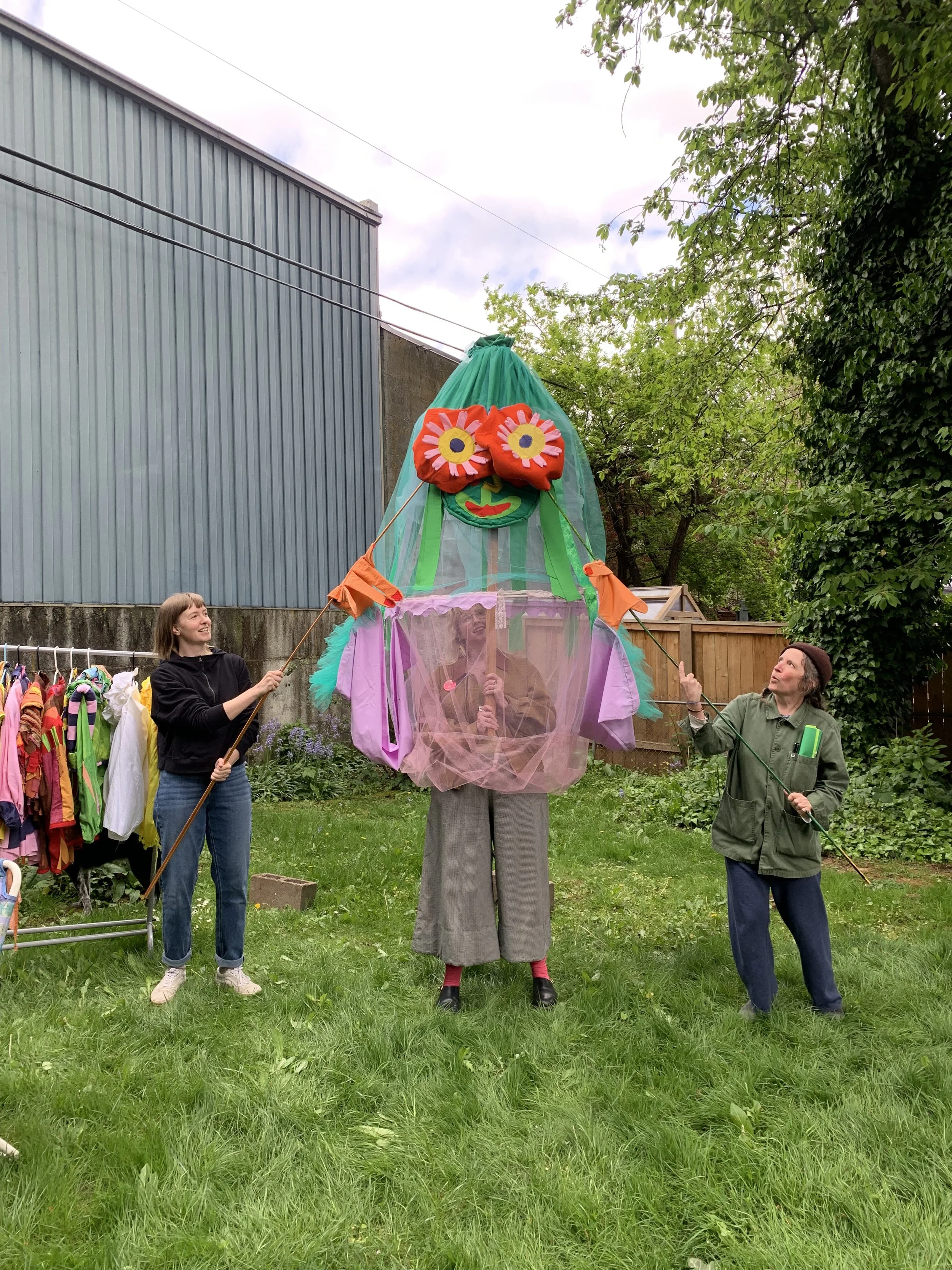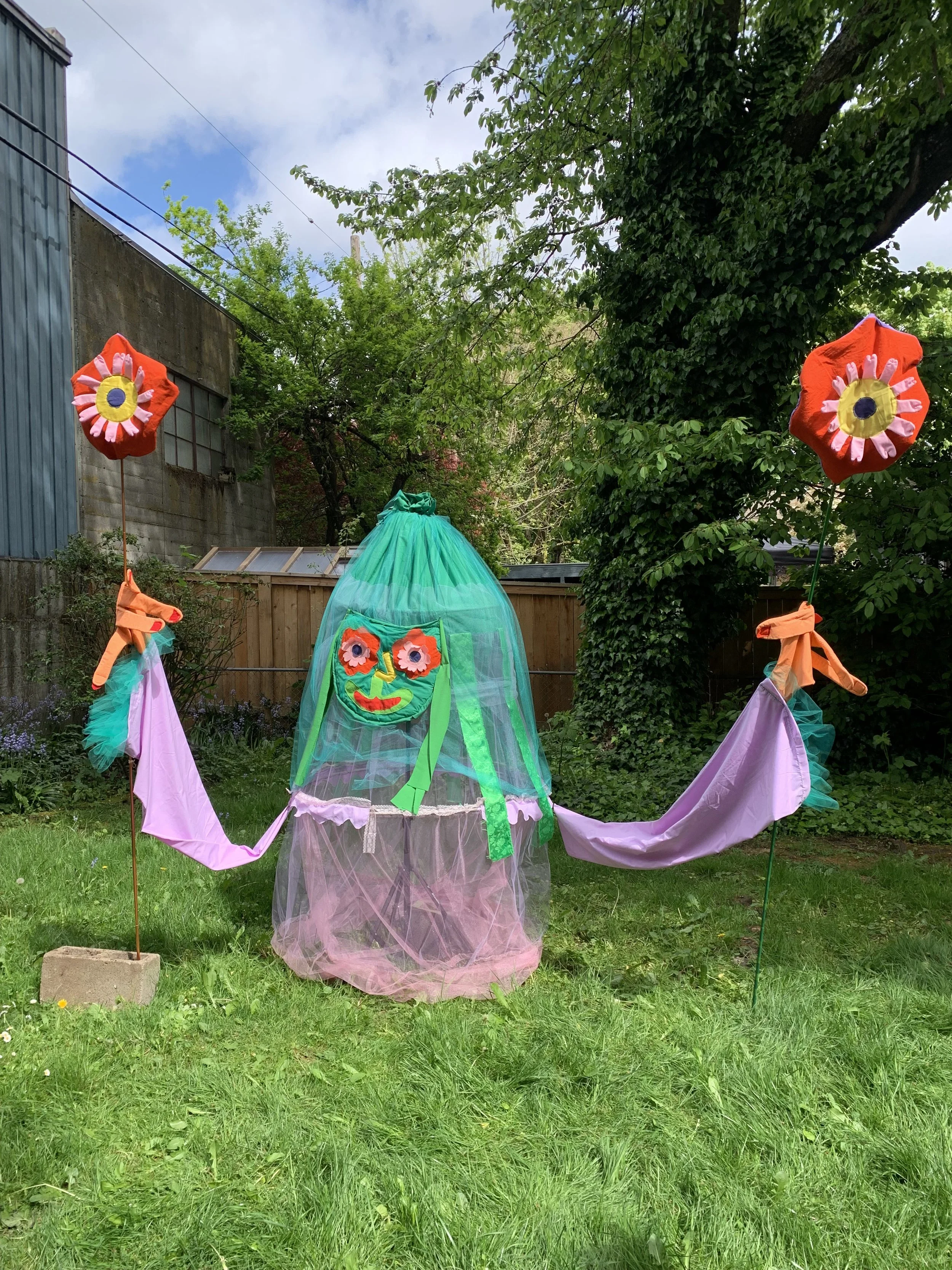 flora. 2025. tulle, pex, fabric, tent poles.giant puppet personifying the spirit of flowers and springtime